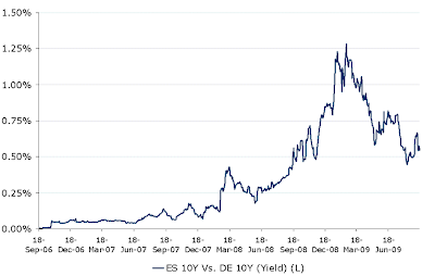 So far, so good. This is the stuff burt bubbles are made of. But this respite offered by the rise in government indebtedness is only viable and worthwhile (after all, you are only creating even more debt, which at some point needs to be paid) if it serves to facilitate the kind of economic correction Spain most urgently needs, which involves inevitably and inexorably transforming itself into an export driven economy. But what happens as the government starts to take on all the debt, well, as we saw last year, the interest differential, or “spread”, that the Spanish government has to pay on its debt suddenly starts to surge, as investors begin to worry about the sustainability of all the new debt.